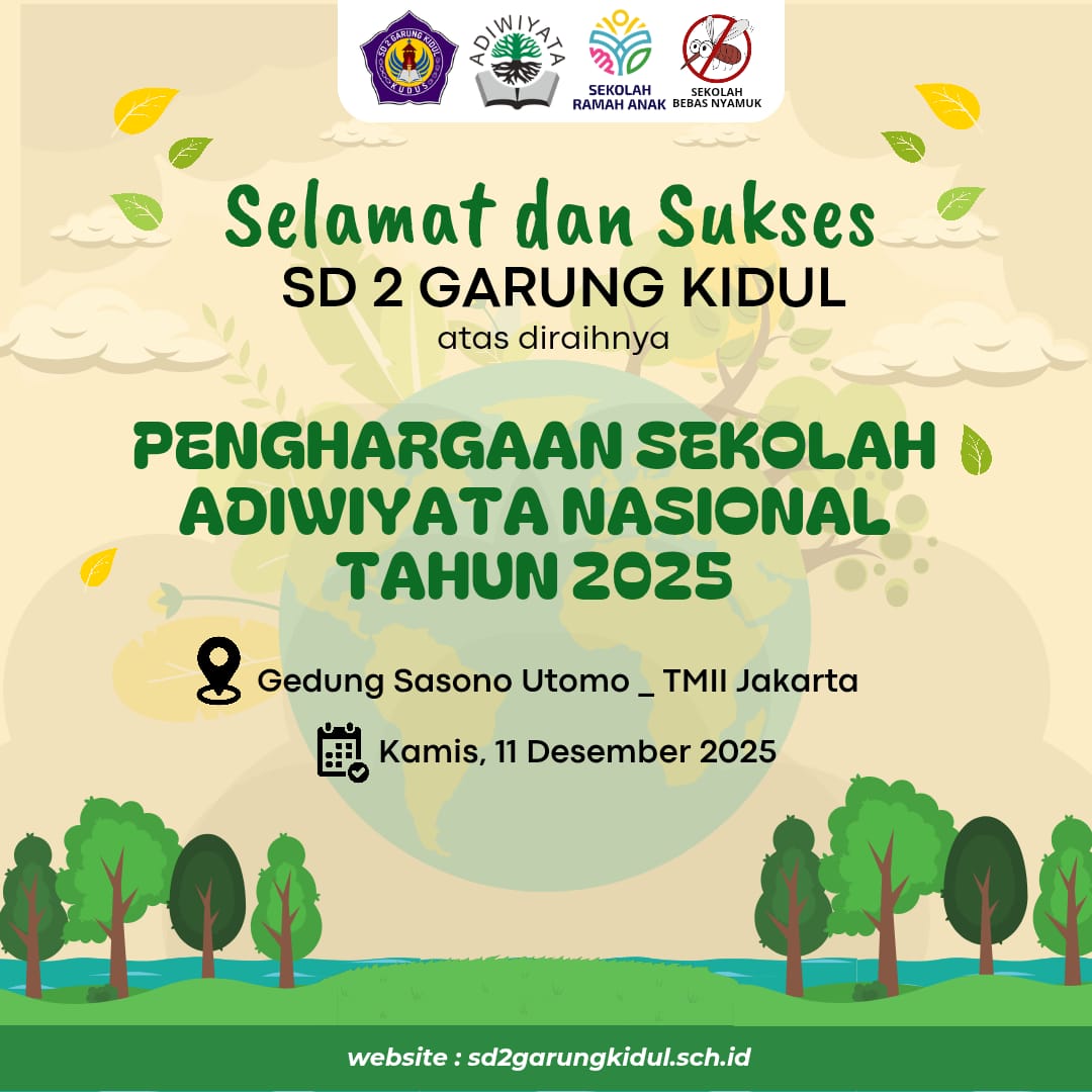 Kudus, 11 Desember 2025 — SD 2 Garung Kidul kembali menorehkan prestasi membanggakan di tingkat nasional. Pada tahun 2025 ini, SD 2 Garung Kidul berhasil meraih Predikat Sekolah Adiwiyata Nasional, sebuah penghargaan bergengsi yang diberikan kepada sekolah-sekolah yang dinilai berhasil mewujudkan lingkungan belajar yang berbudaya lingkungan, bersih, sehat, dan berkelanjutan.